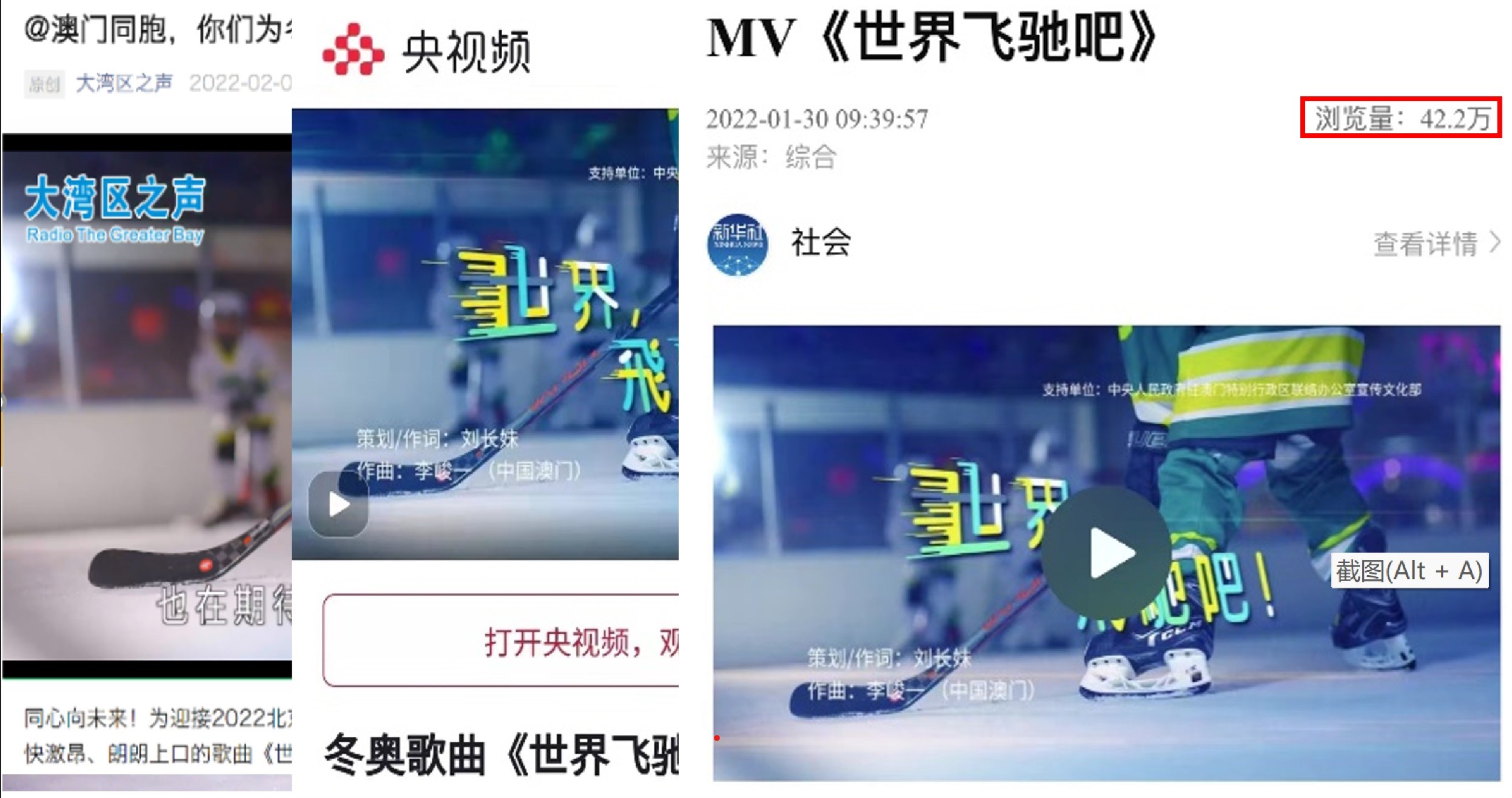 我司負責《世界飛馳吧》MV拍攝及後期製作,整隻MV充滿澳門元素且飽含情感,展現了澳門民眾的運動風采,表達出澳門對北京冬奧期盼以及對冬奧健兒的祝福。歌曲被推選為澳門祝福冬奧會的主推歌曲,經新華社,央視頻,大灣區之聲等平臺露出,瀏覽量達數十萬。