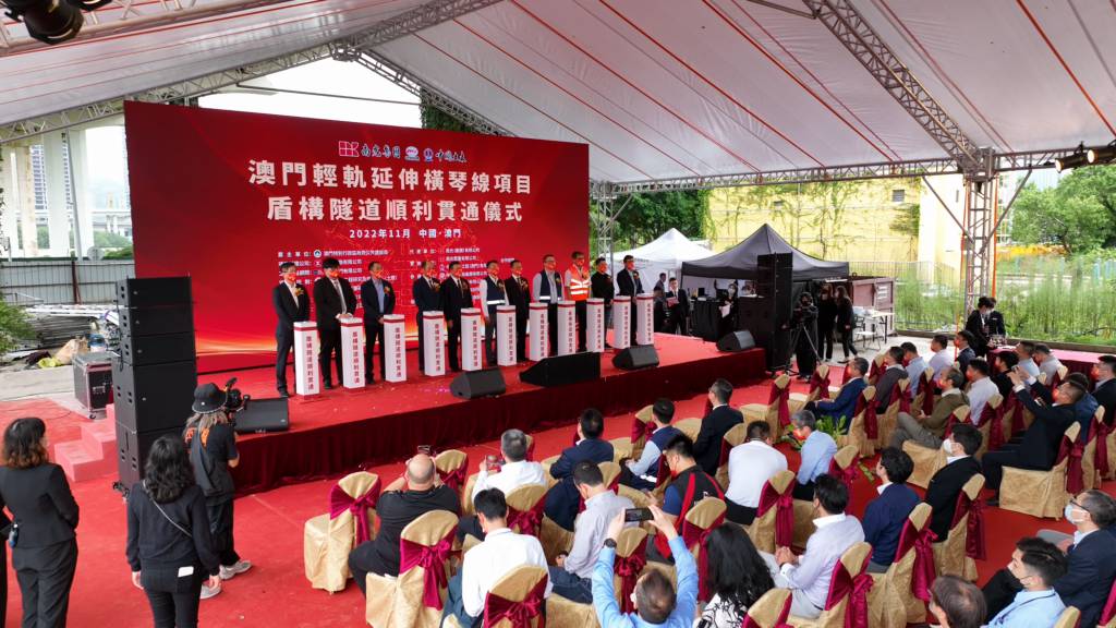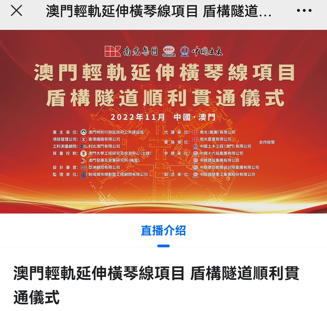 澳門輕軌延伸橫琴線項目首個大直徑海底盾構隧道於2022年11月25日順利貫通,貫通儀式在澳門側項目現場舉行,央視總台、澳廣視、澳門日報等媒體在現場進行報道。