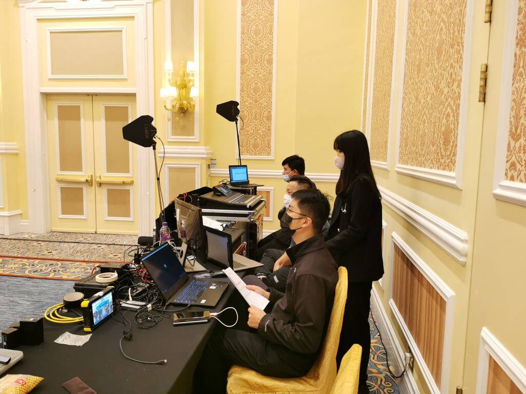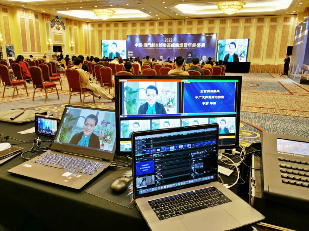 2022中國·澳門劇本娛樂高峰論壇暨年終盛典 13/01/2023 MacBroadcast“2022中國·澳門劇本娛樂高峰論壇暨年終盛典”,11月29日在澳門威尼斯人盛大開幕,旅遊局局長文綺華,貿易投資促進局執行委員李藻森,中聯辦宣文部處長白冰,議員張健中,南光集團有限公司副總經理宋曉冬及金山軟件股份有限公司高級副總裁龔道軍等出席。*盛典會場入口佈置*盛典會場內佈置我司負責開幕盛典會場舞台、LED大屏、音響等系統,線上會議直播以及會場宣傳佈置製作等。*盛典線上嘉賓發言*盛典現場控制台*盛典現場攝像機機位