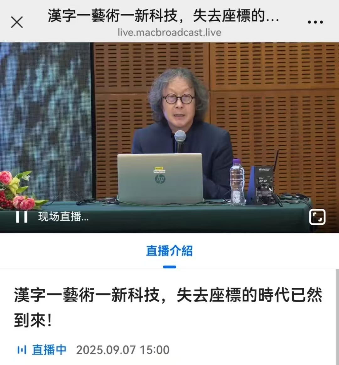 “漢字一藝術一新科技,失去座標的時代已然到來!”講座 18/09/2025 MacBroadcast9月7日澳門文化局在澳門文化中心舉辦了美學說“漢字一藝術一新科技,失去座標的時代已然到來!”講座,邀請中國當代藝術家徐冰,分享其近年來的思想演進,與澳門觀眾一同思考與判斷。*中國當代藝術家徐冰-直播畫面*講座現場觀衆-直播畫面*講座開框畫面*講座直播頁我司負責講座現場多機位拍攝製作,以及活動全程網絡直播。*現場拍攝機位*現場導控台